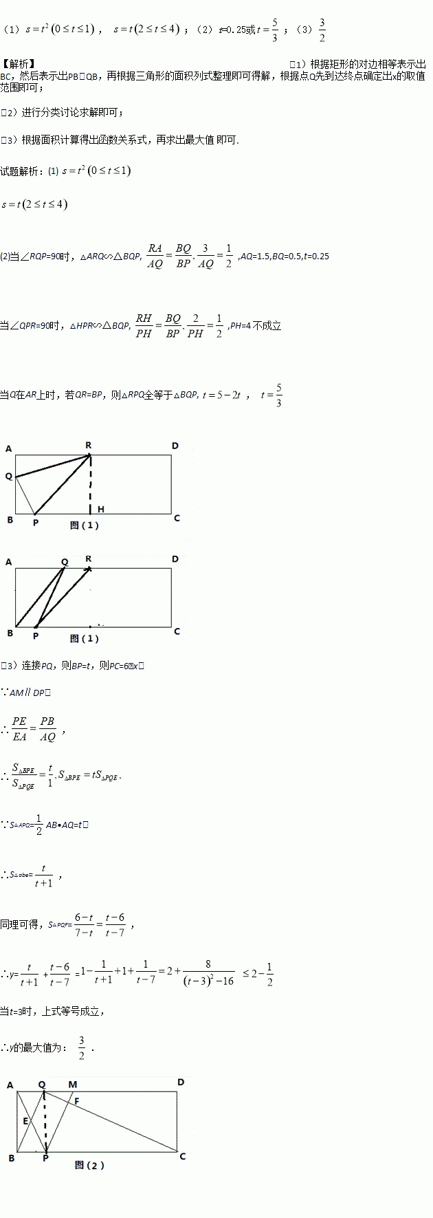 (3)如图(2)M为AD边上一点,AM=2,点Q在1.5秒时便停止运动,点P继续在BC上运动,AP与BQ交于点E,PM交CQ于点F,设四边形QEPF的面积为y,求y的最大值.