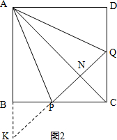 (2)如图2,设AC与PQ交于点N,正方形边长为a,延长AB交QP的延长线于点K,由于点Q,P关于直线AC对称,得到PC=CQ,∠ACP=∠ACQ=45°,∠ANK=∠CNP=90°,AP=AQ,PN=QN,所以∠CAB=∠ACP,∠K=45°△ANK∽△CNP.BK=BP=m,于是得到结论$\frac{AN}{CN}=\frac{AK}{CP}=\frac{AB+BK}{CP}=\frac{a+m}{n}=\frac{2m+n}{n}$;