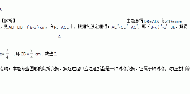 如图,有一张直角三角形纸片,两直角边长AC=6 cm,BC=8 cm,将△ABC折叠,使点B与点A重合,折痕为DE,则CD等于( )