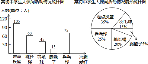 ∴跳长绳的人数为300×20%=60(人),踢毽子的人数为300×5%=15(人),