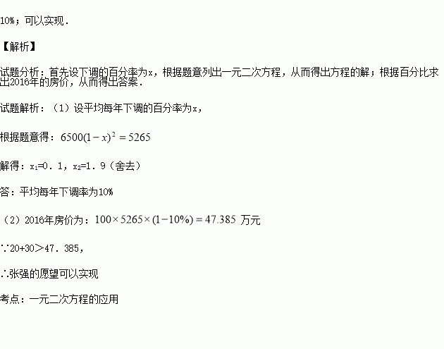 (2)假设2016年的均价仍然下调相同的百分率,张强准备购买一套100平方米的住房,他持有现金20万元,可以在银行贷款30万元,张强的愿望能否实现?(房价每平方米按照均价计算)