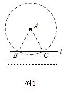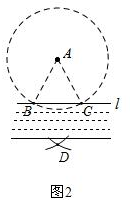 解答 解:①以点A为圆心,适当长度(保证与l有两个交点)为半径画圆,与l交于B、C两点,连接AB、AC,如图1:②分别以B、C为圆心,BC长为半径画弧,两弧在BC的下方交于点D,如图2:③连接AD,交l于点O,线段AO即为最近路线图,如图3: