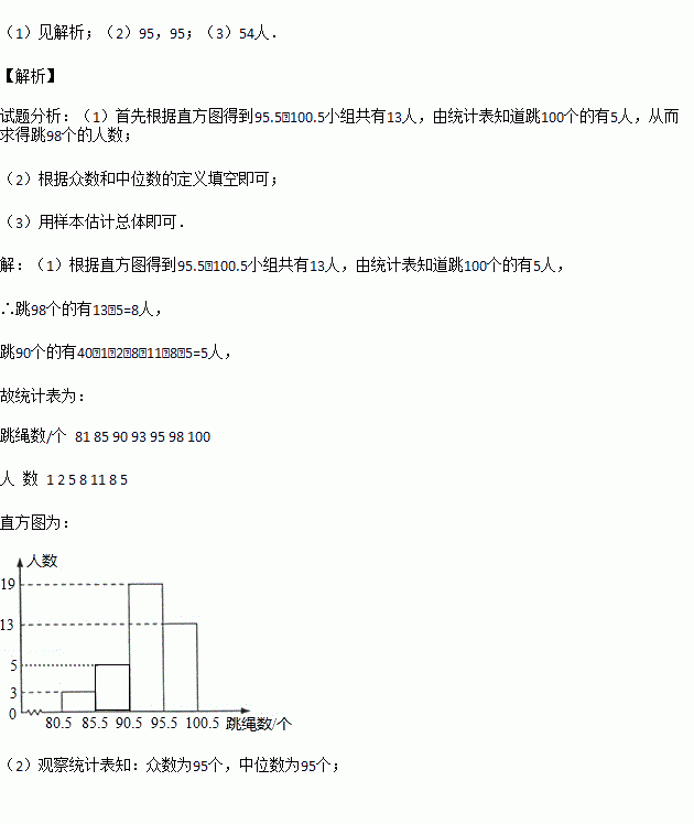 (2)这个班同学这次跳绳成绩的众数是 个,中位数是 个;