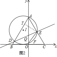 (3)①由相似三角形的性质得到$\frac{AD}{AQ}=\frac{AF}{AE}$,根据线段的和差得到AD•AE=(AQ+QF)•AQ,化简即可得到结论;②如图2,过点E作ET⊥AB于T,解直角三角形得到E=AE•sin60°=$\frac{\sqrt{3}}{2}$b,求得S△ADE=$\frac{\sqrt{3}}{4}$ab,当α=90°时,此时DE∥x轴,S△ADE最小,根据相似三角形的性质得到$\frac{DE}{BC}=\frac{AQ}{AO}=\frac{2}{3}$,得到$\frac{{{S_{△ADE}}}}{{3\sqrt{3}}}=\frac{4}{9}$${S_{△ADE}}=\frac{4}{9}×3\sqrt{3}=\frac{{4\sqrt{3}}}{3}$,当α=120°时,此时DE经过点C,即点E和点C重合,S△ADE最大,根据三角形的面积得到$\frac{16}{3}≤ab≤6$,代入化简即可得到结论.