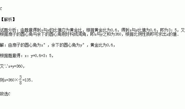 (2009•毕节地区)如图,扇子的圆心角为x°,余下的圆心角为y°,x与y的比通常用黄金比来设计,这样的扇子造型美观,若取黄金比为0.6,则x应为( )
