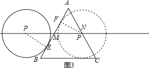 注意:由于对称性可知,当P点运动到AB右侧时也存在⊙P切AB,此时PM也是为2,即P点为N点,同理可得P点在N点时,⊙P切BC.这两点都在第二种情况运动时间内.
