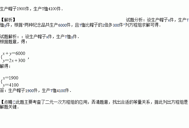 某工厂经审批,可生产纪念北京申办2022年冬奥会成功的帽子和T恤.若两种纪念品共生产6000件,且T恤比帽子的2倍多300件.问生产帽子和T恤的数量分别是多少?