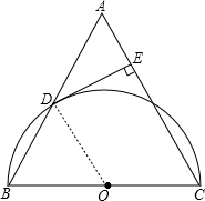 已知△ABC中,AB=AC,DE⊥AC于点E,DE与半⊙O相切于点D.