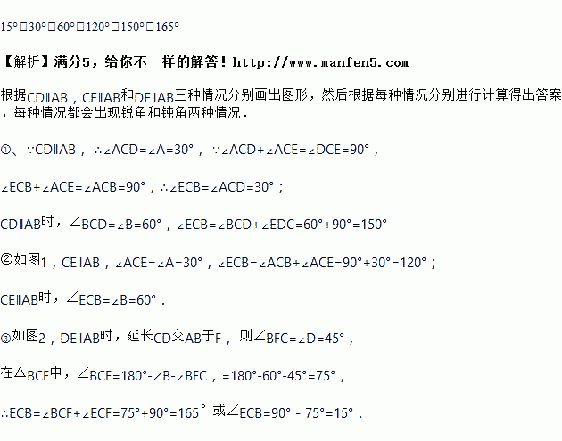 如图,将一幅三角板的直角顶点重合放置,其中∠A=30°,∠CDE=45°.若三角板ACB的位置保持不动,将三角板DCE绕其直角顶点C顺时针旋转一周.当△DCE一边与AB平行时,∠ECB的度数为_________________________.