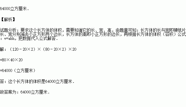 (2015秋•孝义市期末)如图是以长为120cm,宽为80cm的长方形硬纸,在它的四个角处各剪去一个边长为20cm的正方形后,将其折叠成如图所示的无盖的长方体,则这个长方体的体积为 .