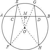 分析:连接OE,OF,OG,OH;作OM垂直于AB,交AB于点M;根据题意易得OC=OD,进而可得△OCF≌△ODH;由此可得∠OFE=∠OHG,又可得△OEF≌△OGH;根据全等三角形的性质,可得EF=GH.