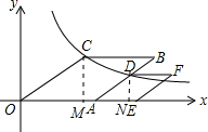 分析 过点C作CM⊥x轴于M,过点D作DN⊥x轴于N,如图,易得CM=$\frac{1}{2}$OA,DN=$\frac{1}{2}$AE,OM=$\frac{\sqrt{3}}{2}$OA,AN=$\frac{\sqrt{3}}{2}$AE.由点C、点D在反比例函数y=$\frac{k}{x}$(k>0,x>0)的图象上可得OM•CM=ON•DN,从而可得$\frac{\sqrt{3}}{2}$OA•$\frac{1}{2}$OA=(OA+$\frac{\sqrt{3}}{2}$AE)•$\frac{1}{2}$AE,整理可得OA2-AE2=$\frac{2\sqrt{3}}{3}$OA•AE,即可求出OA2-AE2,就可求出菱形OABC的面积与菱形AEFD的面积差.