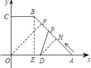 分析 (1)如图作BE⊥OA于E,作OF⊥AB于F,DH⊥AB于H,得到OE=BC=4,在Rt△ABE中,AE=OA-OE=6,BE=OC=8,求出AB=10,因为OA•BE=AB•OF,得到OF=$\frac{OA•BE}{AB}$=8,DH=$\frac{1}{2}$OF=4,得到S=$\frac{1}{2}AP$•DH=$\frac{1}{2}$t•4=2t,求得t=10时,S最大=20;
