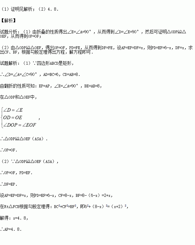 如图,矩形ABCD中,AB=8,BC=6,P为AD上一点,将△ABP沿BP翻折至△EBP,PE与CD相交于点O,且OE=OD.