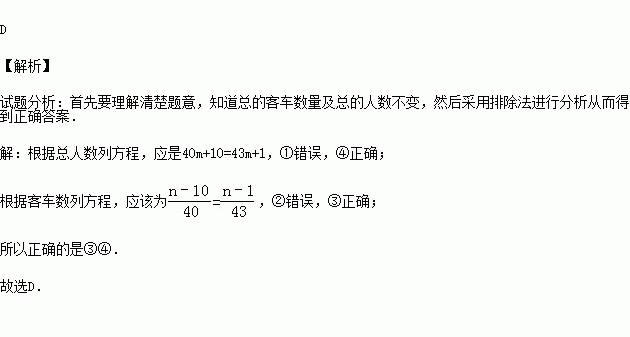 (2015秋•鞍山期末)有m辆客车及n个人,若每辆客车乘40人,则还有10人不能上车,若每辆客车乘43人,则只有1人不能上车,有下列四个等式:①40m+10=43m﹣1;②