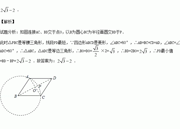 如图,在菱形ABCD中,∠ABC=60°,AB=2,点P是这个菱形内部或边上的一点,若以点P、B、C为顶点的三角形是等腰三角形,则P、D(P、D两点不重合)两点间的最短距离为 .