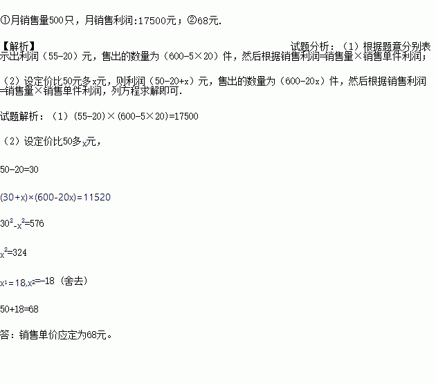 ①当销售单价定为每只55元时,计算月销售量和月销售利润;