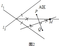 (2)如图2:某通信公司在A区要修建一座信号发射塔M,要求发射塔到两城镇P、Q的距离相等,同时到两条高速公路l1、l2的距离也相等.在图中作出发射塔M的位置.(不写作法,保留作图痕迹)