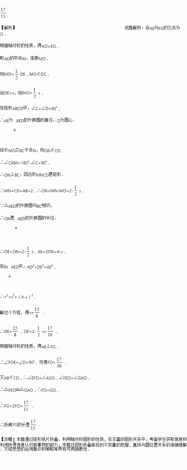 如图,矩形纸片ABCD中,AD= 1,AB一2.将纸片折叠,使顶点A与边CD上的点E重合,折痕FG分别与AB、CD交于点G、F,AE与FG交于点仪当触ED的外接圆与BC相切于BC的中点N.则折痕FG的长为________