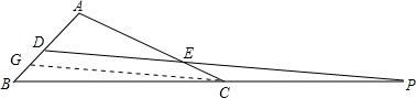 分析 过点C作CG∥DP交AB于G,根据平行线分线段成比例定理可得$\frac{AD}{DG}=\frac{AE}{AC}$,$\frac{BD}{DG}=\frac{BP}{CP}$,变形比例式表示DG,得$\frac{AD•EC}{AE}$=$\frac{BD•CP}{BP}$,又BD=EC,得到$\frac{AD}{AE}=\frac{CP}{BP}$,化为等积式即可.
