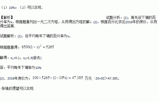 (2)假设2016年的均价仍然下调相同的百分率,小明准备购买一套100平方米的住房,他持有现金20万元,可以在银行贷款30万元,小明的愿望能否实现?(房价每平方米按照均价计算)