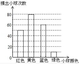 试题分析:(1)用摸到红色球的次数除以占的百分比即是实验总次数,用总次数减去红黄绿球的次数即为摸蓝球的次数,再补全条形统计图即可;