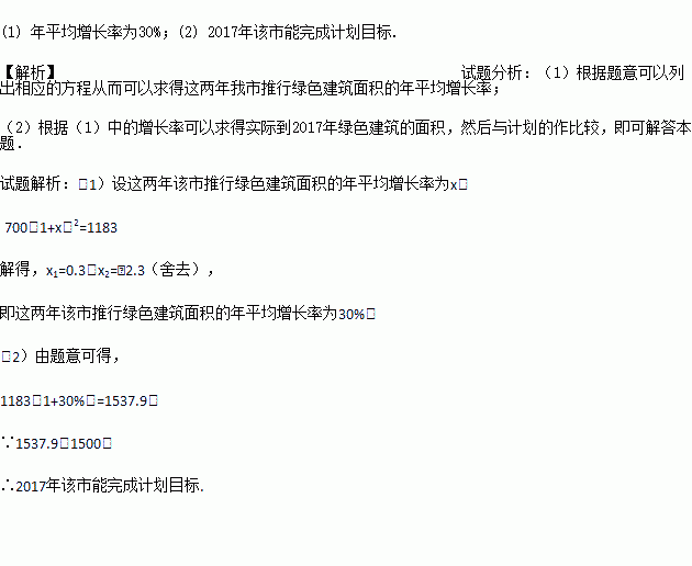 £¨2£©2017ÄêÎÒÊмƻ®ÍÆÐÐÂÌÉ«½¨ÖþÃæ»ý´ïµ½2400Íòƽ·½Ã×£®Èç¹û2017ÄêÈÔ±£³ÖÏàͬµÄÄêÆ½¾ùÔö³¤ÂÊ£¬ÇëÄãÔ¤²â2017ÄêÎÒÊÐÄÜ·ñÍê³É¼Æ»®Ä¿±ê£¿