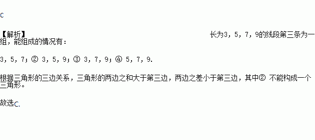 一根长竹签切成四段,分别为3cm、5cm、7cm、9cm.从中任意选取三根首尾依次相接围成不同的三角形,则围成的三角形共有( ).