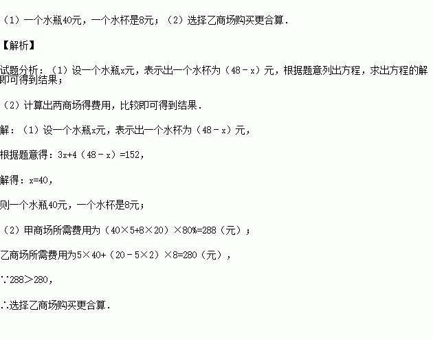 (2)甲、乙两家商场同时出售同样的水瓶和水杯,为了迎接新年,两家商场都在搞促销活动,甲商场规定:这两种商品都打八折;乙商场规定:买一个水瓶赠送两个水杯,另外购买的水杯按原价卖.若某单位想要买5个水瓶和20个水杯,请问选择哪家商场购买更合算,并说明理由.(必须在同一家购买)