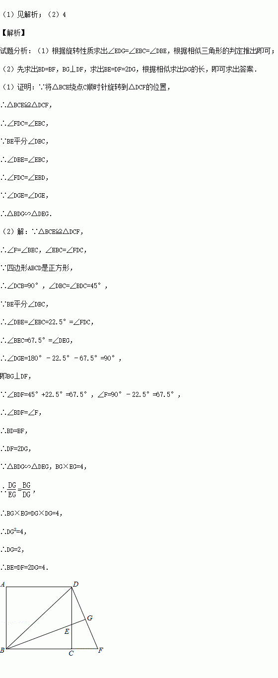 (2012•长沙)如图,已知正方形ABCD中,BE平分∠DBC且交CD边于点E,将△BCE绕点C顺时针旋转到△DCF的位置,并延长BE交DF于点G.