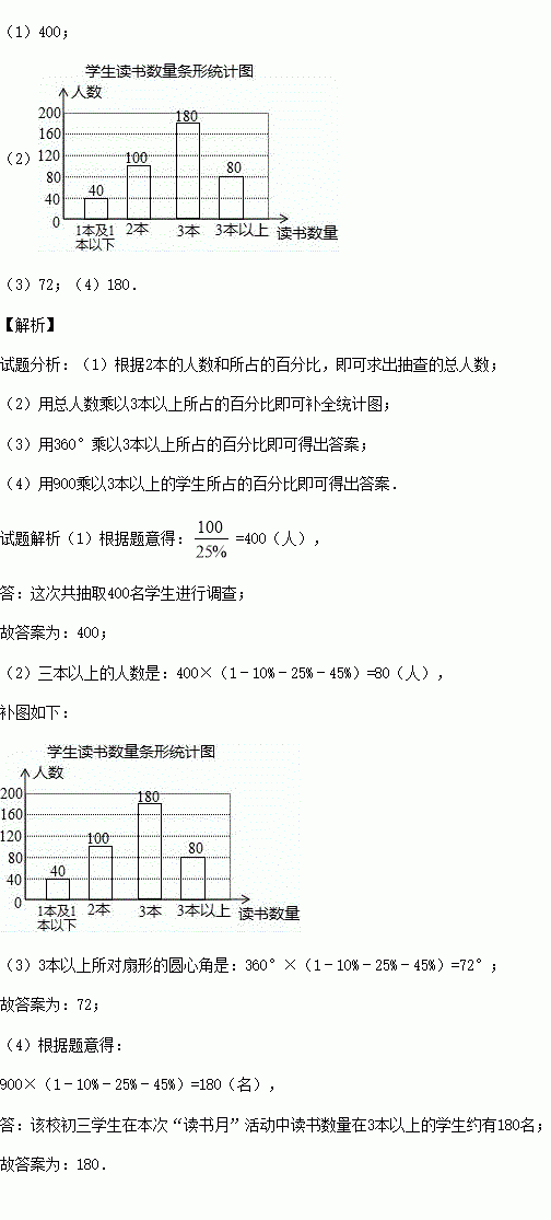 (3)在学生读书数量扇形统计图中,3本以上所对扇形的圆心角是 度;