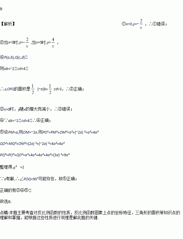 ;②△OPQ的面积为定值; ③x>0时,y随x的增大而增大; ④MQ=2PM;⑤∠POQ可以等于90°.