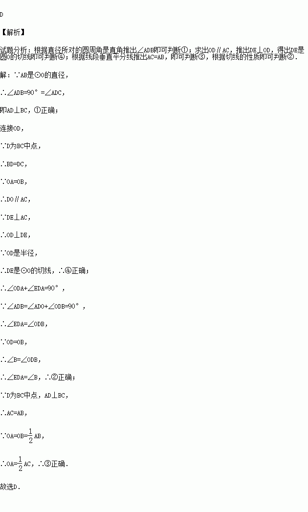 (2015•临淄区校级模拟)如图,AB是⊙O的直径,⊙O交BC的中点于D,DE⊥AC于E,连接AD,则下列结论: