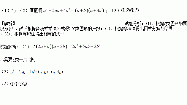 (1)取图①中的若干个(三种图形都要取到)拼成一个长方形,使它的边长分别为(2a+b)、(a+2b),不画图形,试通过计算说明需要C类卡片多少张;