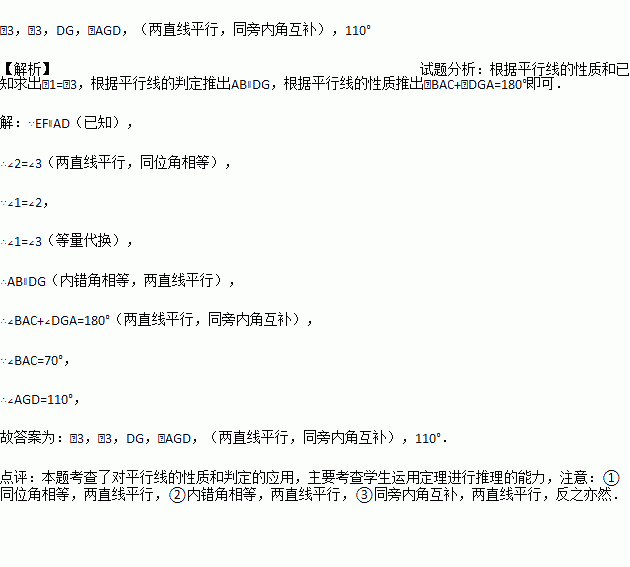 如图,已知EF∥AD,∠1=∠2,∠BAC=70°.将求∠AGD的过程填写完整.