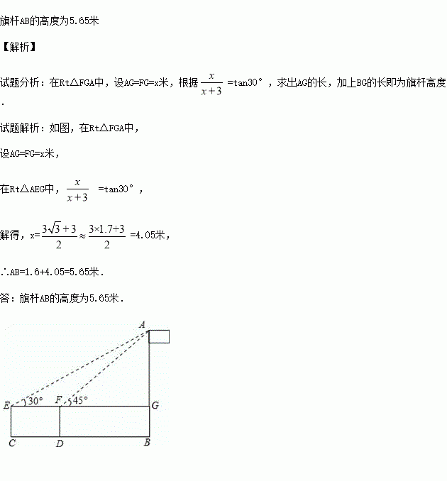 如图,身高1.6米的小明为了测量学校旗杆AB的高度,在平地上C处测得旗杆高度顶端A的仰角为30°,沿CB方向前进3米到达D处,在D处测得旗杆顶端A的仰角为45°,求旗杆AB的高度(