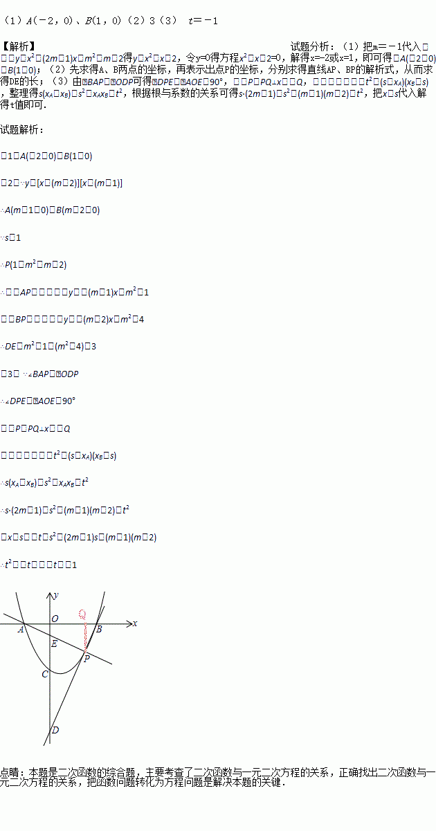 如图,已知抛物线y=x2-(2m+1)x+m2+m-2与x轴交于A、B两点,点A在点B的左边,与y轴交于点C,P(s,t)为抛物线上A、B之间一点(不包括A、B),连接AP、BP分别交y轴于点E、D