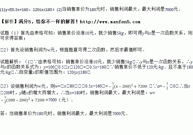 一茶叶专卖店经销某种品牌的茶叶,该茶叶的成本价是80元/kg,销售单价不低于120元/kg.且不高于180元/kg,经销一段时间后得到如下数据: