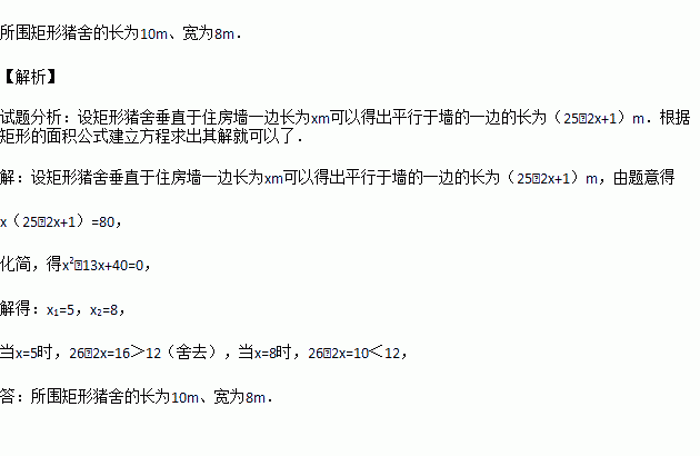 如图,一农户要建一个矩形猪舍,猪舍的一边利用长为12m的住房墙,另外三边用25m长的建筑材料围成,为方便进出,在垂直于住房墙的一边留一个1m宽的门,所围矩形猪舍的长、宽分别为多少时,猪舍面积为80m2?