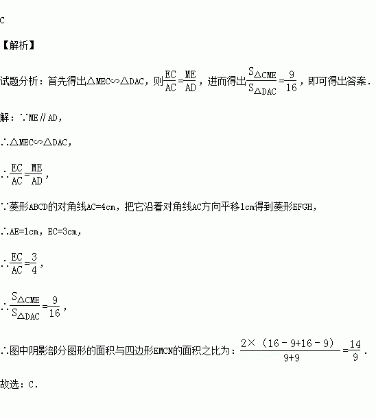 如图,菱形ABCD的对角线AC=4cm,把它沿着对角线AC方向平移1cm得到菱形EFGH,则图中阴影部分图形的面积与四边形EMCN的面积之比为( )
