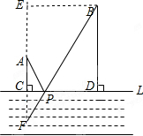 解答 解:(1)作点A关于L的对称点F,连接BF交CD于点P,则点P为所求,此时PA+PB=BF,BF就是最短路程.![]()