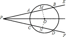 分析 过O作OM⊥PB于M,ON⊥PD于N.根据角平分线的性质可知OM=ON,根据垂径定理求得AB=CD,BM=AM=$\frac{1}{2}$AB,ND=CN=$\frac{1}{2}$CD,再利用全等三角形的性质证明PM=PN,进而即可证明PB=PD,PA=PC.