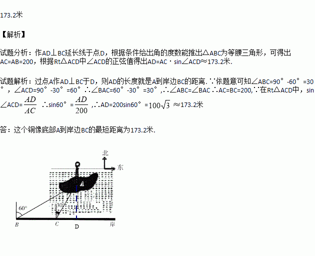 如图,郴州北湖公园的小岛上有为了纪念唐代著名诗人韩愈而建的韩愈铜像,其底部为A.某人在岸边的B处测得A在B的北偏东60°的方向上.然后沿岸边直行200米到达C处,再次测得A在C的北偏东30°的方向上(其中A,B,C在同一平面上).求这个铜像底部A到岸边BC的距离(结果精确到0.1米,参考数据: