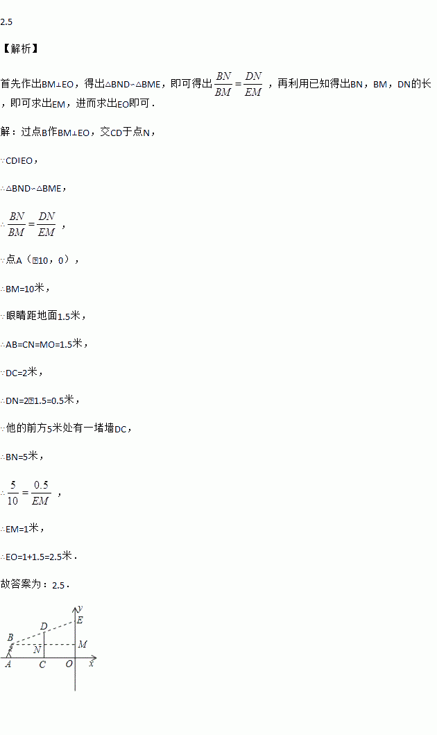 如图,直角坐标平面内,小明站在点A(﹣10,0)处观察y轴,眼睛距地面1.5米,他的前方5米处有一堵墙DC,若墙高DC=2米,则小明在y轴上的盲区(即OE的长度)为_____米.