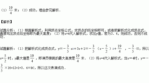 (2)已知人梯高BC=3.4米,在一次表演中,人梯到起跳点A的水平距离是4米,问这次表演是否成功?请说明理由.