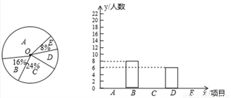 某校决定对学生感兴趣的球类项目(A:足球,B:篮球,C:排球,D:羽毛球,E:乒乓球)进行问卷调查,学生可根据自己的喜好选修一门,李老师对某班全班同学的选课情况进行统计后,制成了两幅不完整的统计图(如图).