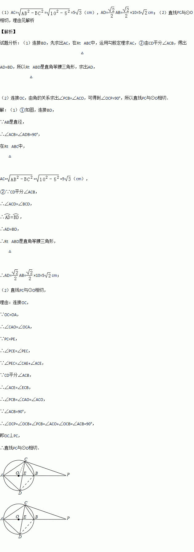 如图,⊙O的直径AB为10cm,弦BC为5cm,D、E分别是∠ACB的平分线与⊙O,AB的交点,P为AB延长线上一点,且PC=PE.