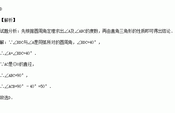 (2015秋•岳池县期末)如图,△ABC内接于⊙O,AC是⊙O的直径,∠BDC=40°(点D在⊙O上),则∠ACB=( )