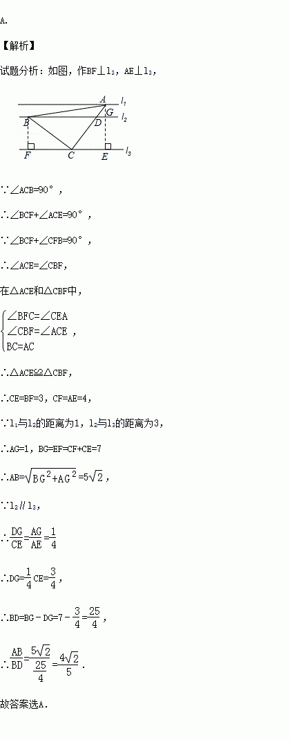 如图,直线l1∥l2∥l3,一等腰直角三角形ABC的三个顶点A,B,C分别在l1,l2,l3上,∠ACB=90°,AC交l2于点D,已知l1与l2的距离为1,l2与l3的距离为3,则