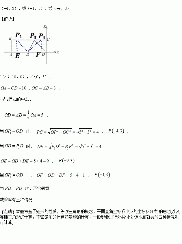 标系中,O为原点,四边形OABC是矩形,A(-10,0),C(0,3),点D是OA的中点,点P在BC边上运动,当△ODP是腰长为5的等腰三角形时,点P的坐标是 ______ .